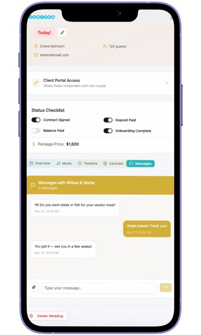 ditch the chaos. track inquiries, manage weddings, send contracts, accept payments, and give your clients a gorgeous portal — all in one place.