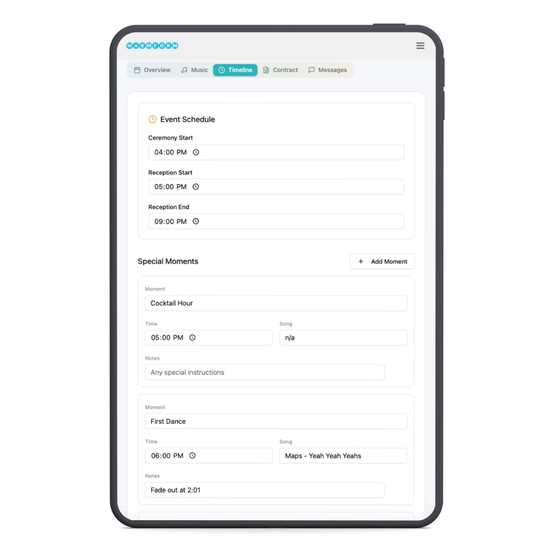 WarmForm gives you a dedicated event dashboard for each wedding, keeping ceremony details, questionnaires, timelines, vendor notes, and music preferences neatly organized in one place. no more hunting through emails or spreadsheets — every detail you need is instantly accessible.